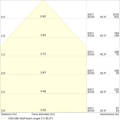 Der Abstrahlwinkel bezeichnet den Winkel, in dem das Licht aus der Lichtquelle ausgestrahlt wird. Er wird in Grad (D) angegeben. Je geringer die Gradzahl des Abstrahlwinkels ist, desto kleiner ist auch der Durchmesser des Lichtkegels, den die Lichtquelle produziert. Beispiel: Wird eine Lampe mit einem Abstrahlwinkel von 60 Grad an der Decke (2,5 m Höhe) angebracht, erzeugt sie einen Lichtkegel von 2,9 Metern Durchmesser. Hat die Lampe hingegen einen Abstrahlwinkel von 120 Grad, beträgt der Lichtkegel 8,7 Meter im Durchmesser. |