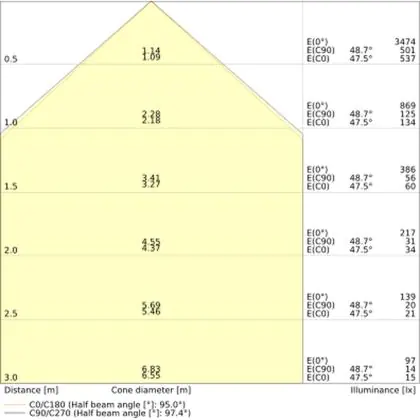 Der Abstrahlwinkel bezeichnet den Winkel, in dem das Licht aus der Lichtquelle ausgestrahlt wird. Er wird in Grad (D) angegeben. Je geringer die Gradzahl des Abstrahlwinkels ist, desto kleiner ist auch der Durchmesser des Lichtkegels, den die Lichtquelle produziert. Beispiel: Wird eine Lampe mit einem Abstrahlwinkel von 60 Grad an der Decke (2,5 m Höhe) angebracht, erzeugt sie einen Lichtkegel von 2,9 Metern Durchmesser. Hat die Lampe hingegen einen Abstrahlwinkel von 120 Grad, beträgt der Lichtkegel 8,7 Meter im Durchmesser. |