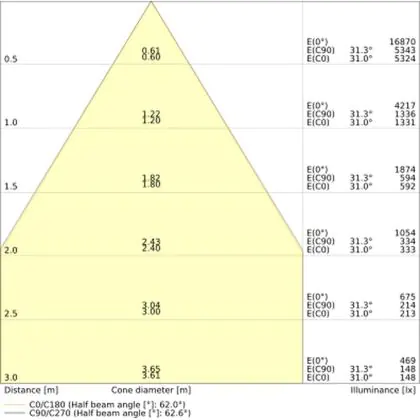 Der Abstrahlwinkel bezeichnet den Winkel, in dem das Licht aus der Lichtquelle ausgestrahlt wird. Er wird in Grad (D) angegeben. Je geringer die Gradzahl des Abstrahlwinkels ist, desto kleiner ist auch der Durchmesser des Lichtkegels, den die Lichtquelle produziert. Beispiel: Wird eine Lampe mit einem Abstrahlwinkel von 60 Grad an der Decke (2,5 m Höhe) angebracht, erzeugt sie einen Lichtkegel von 2,9 Metern Durchmesser. Hat die Lampe hingegen einen Abstrahlwinkel von 120 Grad, beträgt der Lichtkegel 8,7 Meter im Durchmesser. |