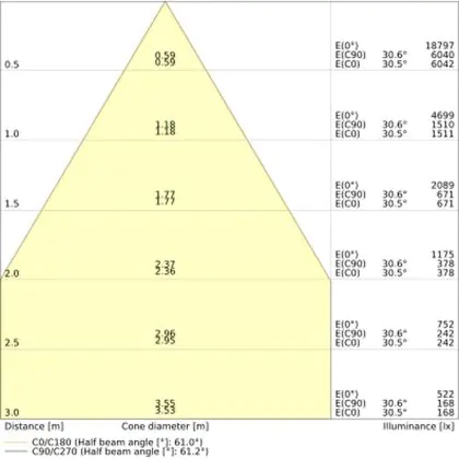 Der Abstrahlwinkel bezeichnet den Winkel, in dem das Licht aus der Lichtquelle ausgestrahlt wird. Er wird in Grad (D) angegeben. Je geringer die Gradzahl des Abstrahlwinkels ist, desto kleiner ist auch der Durchmesser des Lichtkegels, den die Lichtquelle produziert. Beispiel: Wird eine Lampe mit einem Abstrahlwinkel von 60 Grad an der Decke (2,5 m Höhe) angebracht, erzeugt sie einen Lichtkegel von 2,9 Metern Durchmesser. Hat die Lampe hingegen einen Abstrahlwinkel von 120 Grad, beträgt der Lichtkegel 8,7 Meter im Durchmesser. |