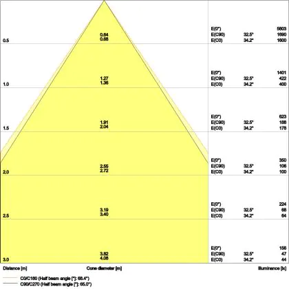 Der Abstrahlwinkel bezeichnet den Winkel, in dem das Licht aus der Lichtquelle ausgestrahlt wird. Er wird in Grad (D) angegeben. Je geringer die Gradzahl des Abstrahlwinkels ist, desto kleiner ist auch der Durchmesser des Lichtkegels, den die Lichtquelle produziert. Beispiel: Wird eine Lampe mit einem Abstrahlwinkel von 60 Grad an der Decke (2,5 m Höhe) angebracht, erzeugt sie einen Lichtkegel von 2,9 Metern Durchmesser. Hat die Lampe hingegen einen Abstrahlwinkel von 120 Grad, beträgt der Lichtkegel 8,7 Meter im Durchmesser. |
