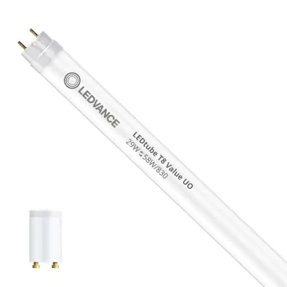Bei der Ledvance LED Röhre T8 Value (EM/Mains) Ultra Output 29W 3150lm - 830 Warmweiß | 150cm - Ersatz für 58W handelt es sich um eine energieeffiziente LED-Röhre. Sie ersetzt Ihre konventionelle Leuchtstoffröhre mit 58W. Die Röhre ist 1514 mm lang und hat die Farbtemperatur 3000K - Warmweiss. Die durchschnittliche Lebensdauer der LED-Röhre beläuft sich auf 30000 Stunden. Wir bieten Ihnen für dieses Produkt eine Garantie von 5 Jahre an.