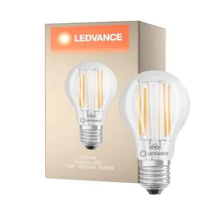 Cette ampoule Ledvance Classic LED E27 Poire Filament Claire 7.5W 1055lm - 840 Blanc Froid | Équivalent 75W avec son efficacité lumineuse de lumen par watt vous permettra de profiter d’un éclairage de qualité. Avec sa durée de vie de 10000 heures, vous n’aurez pas à vous soucier de son remplacement avant quelques années.